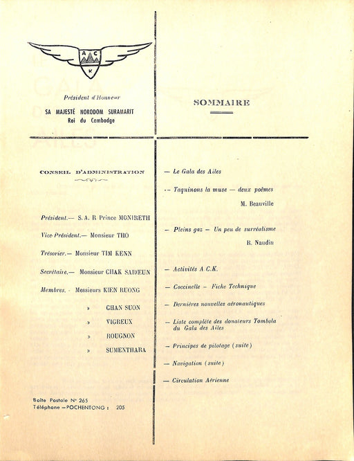 Bulletin de l'Aéro-club Khmer - Août 1957 Vous y apprendrez que le Prince Monireth est le Président du Club; que le Gala des Ailes s'est fait dans ...