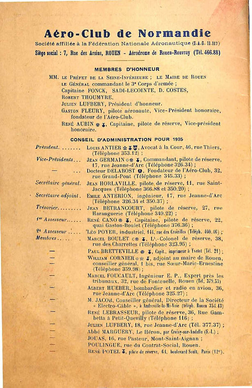 AU SOMMAIRE: Revue de l'Aéro-Club de Normandie Octobre 1935   In memoriam : Eugène Richard, maire de Rouen Départ de M. Le Beau, Préfet de Seine In...