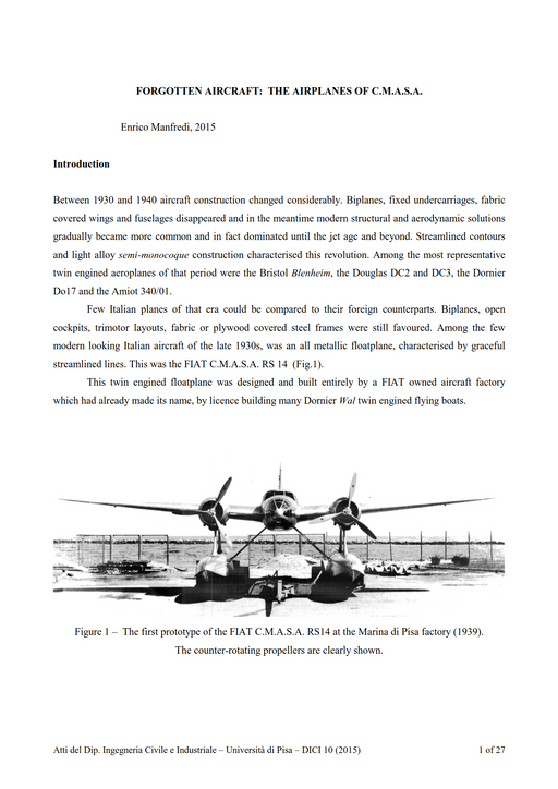 Manfredi, Enrico. - Aerei dimenticati: i velivoli della CMASA (2015) In questo articolo si delinea la storia di una fabbrica di aerei attiva nella ...