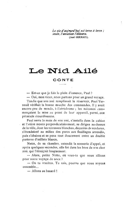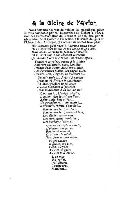 C'è anche un articolo su Auvergne e l'aviazione di G. Sardier, un bel racconto aeronautico di Marcel Perrin, "Le Nid ailé", e anche alcune poesie piuttosto surreali sull'aviazione.