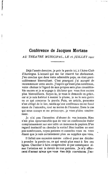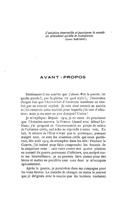 L'editore di "La Vie Aérienne Illustrée" e "La Vie au grand air" aveva contribuito con tre articoli: una prefazione che spiegava il dinamismo del giovane club creato da un asso della prima guerra (aveva regalato al club un Nieuport biposto), un articolo sulle origini dell'aviazione nel XIX secolo, e una conferenza piuttosto lunga sullo stato dell'aviazione in Francia, la politica aeronautica dell'epoca (le riforme di Laurent Eynac) e persino il ruolo delle donne in aviazione,