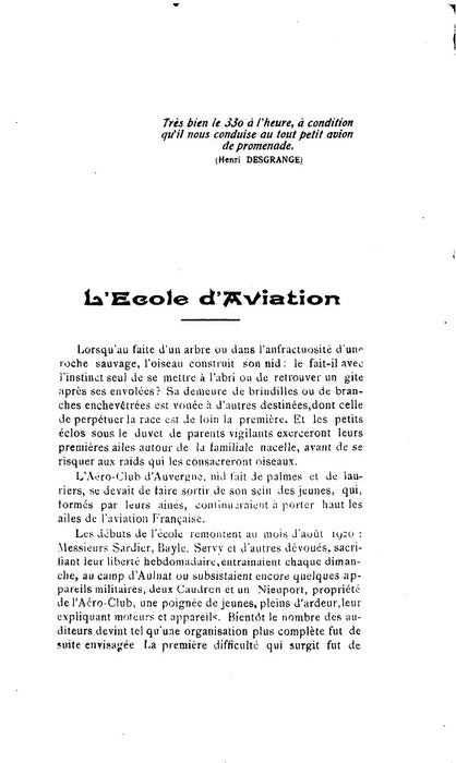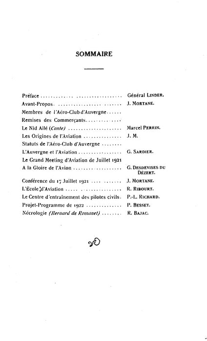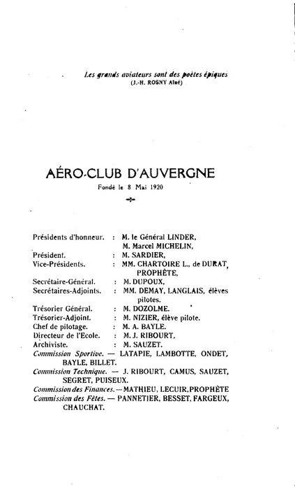 L'8 maggio 1920, due ex assi dell'aviazione militare, Gilbert Sardier e Louis Chartoire, crearono un'associazione destinata a promuovere la guida aerea sportiva, che sarebbe diventata uno dei primissimi aeroclub in Francia il mese successivo. Fin dall'inizio, l'Aéroclub d'Auvergne aveva grandi ambizioni editoriali per il suo annuario di 131 pagine. Si era assicurato il sostegno attivo del principale giornalista e autore aeronautico dell'epoca, Jacques Mortane.