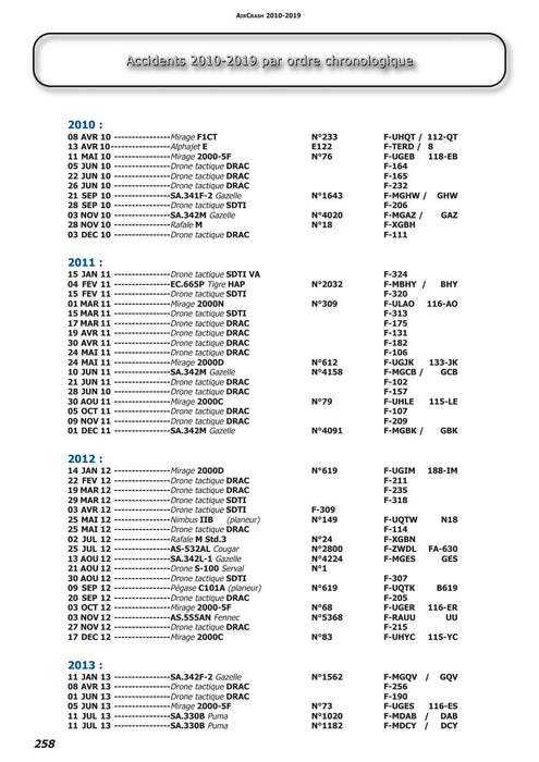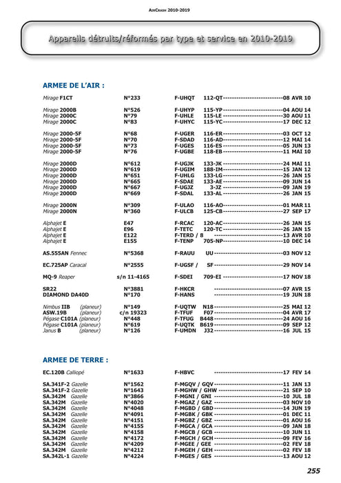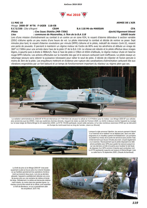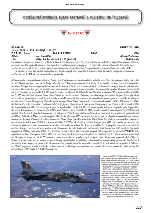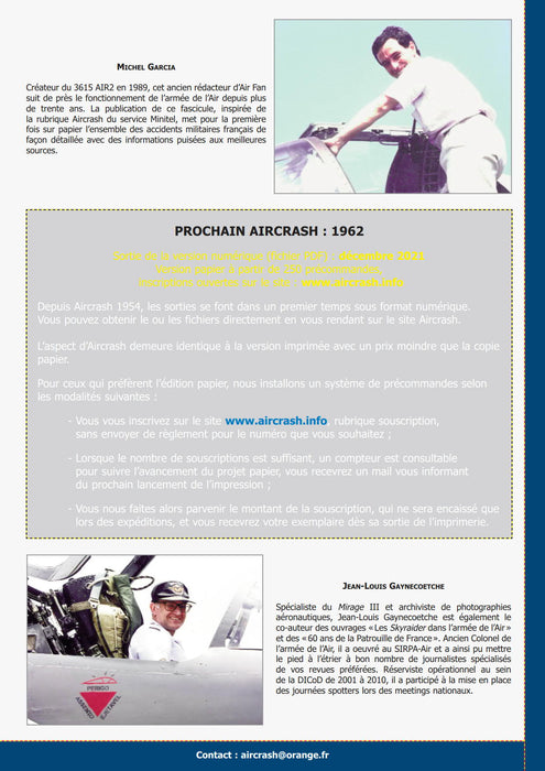 Flight safety has improved enormously in 50 years in all the major Western air forces. On the other hand, missions have become much more complex, with fewer flying hours and confined to geographically restricted areas. Each accident is a reminder that the job of a military pilot is terribly demanding. For many years now, Aircrash has been writing down all French military accidents in detail with information drawn from the best sources. Originally intended mainly for spotters, this compilation was quickly adopted by many other researchers in the aeronautical field: historians, journalists ... and military personnel.