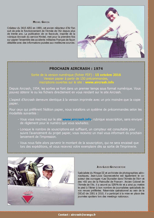 La sicurezza dei voli è migliorata enormemente in 50 anni in tutte le principali forze aeree occidentali. D'altra parte, le missioni sono diventate molto più complesse, con meno ore di volo e limitate ad aree geograficamente ristrette. Ogni incidente ricorda che il lavoro di un pilota militare è terribilmente impegnativo. Per molti anni, Aircrash ha documentato in dettaglio tutti gli incidenti militari francesi con informazioni tratte dalle migliori fonti. Originariamente destinata principalmente agli spotter, questa compilation è stata rapidamente adottata da molti altri ricercatori nel campo dell'aviazione: storici, giornalisti... e militari.