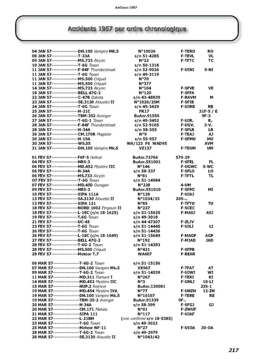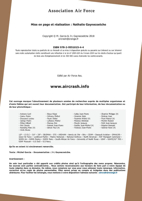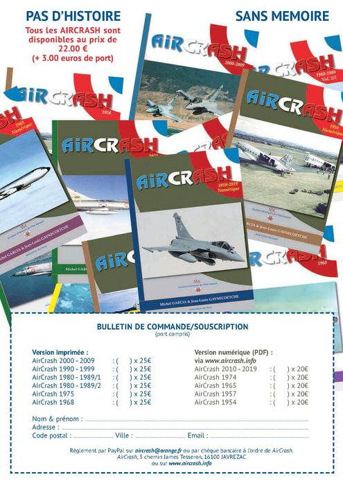 Flight safety has improved enormously in 50 years in all the major Western air forces. On the other hand, missions have become much more complex, with fewer flying hours and confined to geographically restricted areas. Each accident is a reminder that the job of a military pilot is terribly demanding. For many years now, Aircrash has been writing down all French military accidents in detail with information drawn from the best sources. Originally intended mainly for spotters, this compilation was quickly adopted by many other researchers in the aeronautical field: historians, journalists ... and military personnel.