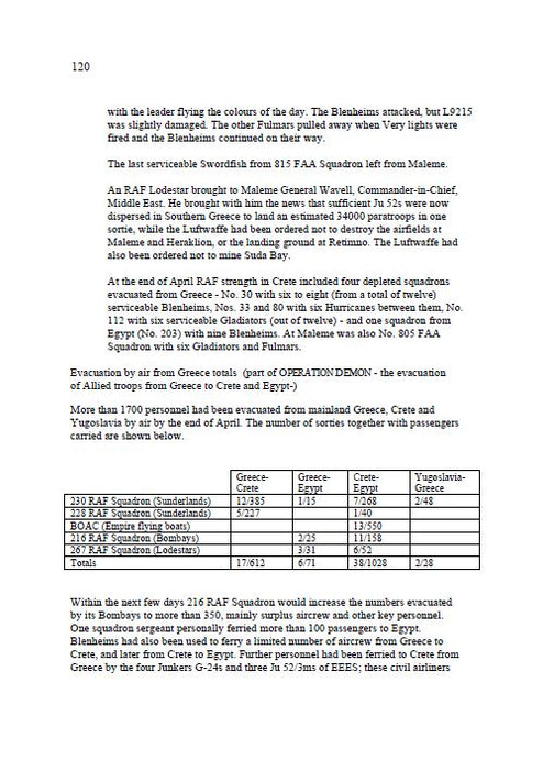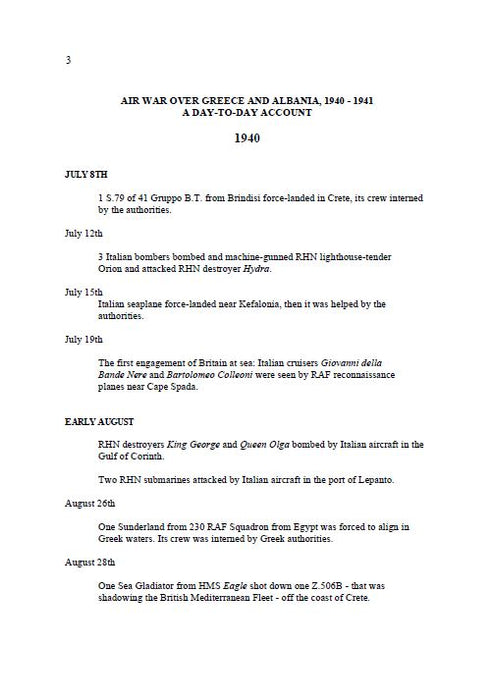Appassionati di thriller facili, passate il passo. Storici in cerca di informazioni cliniche, questo è per voi. Un'impressionante cronologia di 130 pagine di operazioni aeree - giorno per giorno - tra l'8 luglio 1940 (il giorno in cui la megalomania di Mussolini pensava che fosse solo un boccone di Albania e Grecia) e il 30 aprile 1941, la fine dell'operazione DEMON, che segnò la totale evacuazione delle forze alleate dalla Grecia verso la Creta e poi in Egitto.
