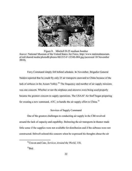 La Fuerza Aérea de los Estados Unidos respondió al requerimiento de mantener a China comprometida contra Japón mediante la realización de dos operaciones de suministro aéreo distintas, una misión táctica de suministro aéreo a Birmania y un esfuerzo de suministro aéreo estratégico sobre el Himalaya a China. El esfuerzo de suministro aéreo táctico a Birmania apoyó las operaciones ofensivas de combate y la construcción de la carretera de Ledo, mientras que el puente aéreo Hump contribuyó directamente al objetivo estratégico estadounidense. A pesar del obstinado compromiso de Stilwell con la carretera de Ledo como principal esfuerzo de suministro a los chinos y del necesario uso del suministro aéreo táctico para apoyar ésta y otras operaciones terrestres en Birmania, la contribución clave para el éxito de mantener a China en la guerra contra el Japón fueron, en última instancia, las misiones de suministro aéreo estratégico sobre el Hump. En esta tesis se examina la forma en que los esfuerzos de transporte aéreo operacional dentro de la CBI (China-Burma-India) apoyaron ambos esfuerzos y se examinan los desafíos, los procesos y el desarrollo del suministro aéreo. La pregunta fundamental asociada a este esfuerzo se refiere a cómo la Fuerza Aérea de los Estados Unidos respondió a los requisitos de suministro aéreo aparentemente en competencia en el teatro de la CBI para mantener a China en la guerra contra el Japón.