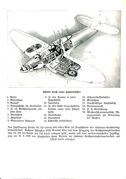 Contenu : Préface du Reichsmarschall Hermann Göring -Histoire et reconstruction de la Luftwaffe - Arme et conduite générale de la guerre - Aviateurs de combat - Aviateurs de chasse - Aviateurs de reconnaissance - Aviateurs sur mer - L'aviation à disque remorqué - Puissance aérienne de l'étranger - L'école de parachutisme - L'artillerie antiaérienne - La troupe de renseignement aérien - Le corps des officiers de la Luftwaffe - Le personnel navigant. Le personnel au sol de l'aviation - L'armée de l'air et les chars - Celui de l'armée de l'air - Les avions militaires allemands - L'armement des avions - Le bombardement - Les pré-écoles techniques aéronautiques - L'automobile de l'armée de l'air - Le service sanitaire de l'armée de l'air - La musique de l'armée de l'air - La juridiction militaire de l'armée de l'air - Le service météorologique et l'armée de l'air - Uniformes et drapeaux de l'armée de l'air. - Deutsches / Drittes Reich, puissance aérienne du national-socialisme, armée de l'air allemande avant la 2ème guerre mondiale. Guerre mondiale, avion de guerre, parachutistes, Flak, guerre aérienne, armes de bord, équipement d'avion, personnel de vol, pilotes de combat et de bombardement, appareil optique de visée de bombes Goerz-Boykow / Zeiss, magasin horizontal pour cinq bombes de 50 kg, automate de largage de rangées de bombes, Chargement d'un avion de bombardement, avions de combat en piqué, en piqué, mitrailleuse d'avion MG 15, caméra MG photo, mitrailleuse d'avion MG FF, mitrailleuse d'avion MG 15 mobile avec tambour à munitions et cimier circulaire, avions de combat en piqué en attaque, Stuka.