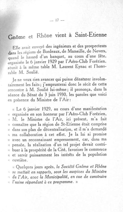 Среди компаний, на которые нацелена эта программа, были Gnôme и Rhône, в то время один из крупнейших производителей двигателей в мире. Gnôme et Rhône отправили инженеров и геологоразведчиков в районы Бордо, Марселя и Невера, когда случайно на банкете Аэро-Клуба за одним столом собрались министр и сенатор Сент-Этьена.