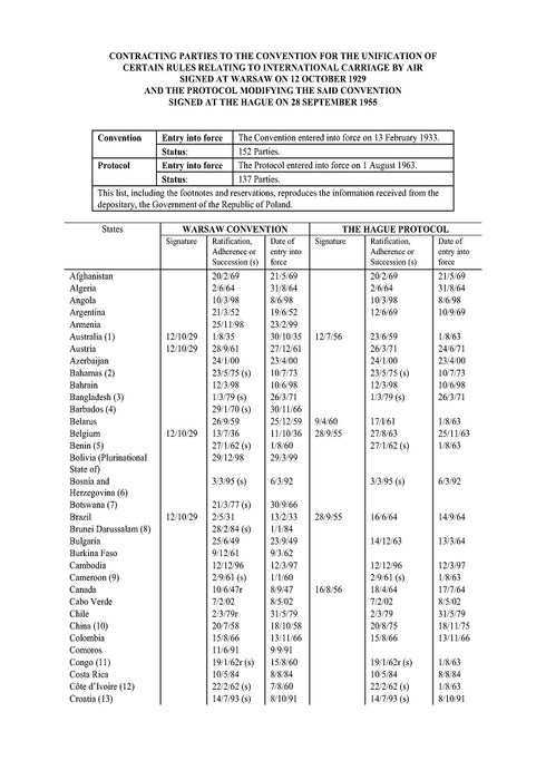 El Convenio de Varsovia sigue aplicándose a todo el transporte aéreo internacional entre Estados que no son partes en el Convenio de Montreal, o entre un Estado que ha ratificado el Convenio de Montreal y un Estado que no es parte.